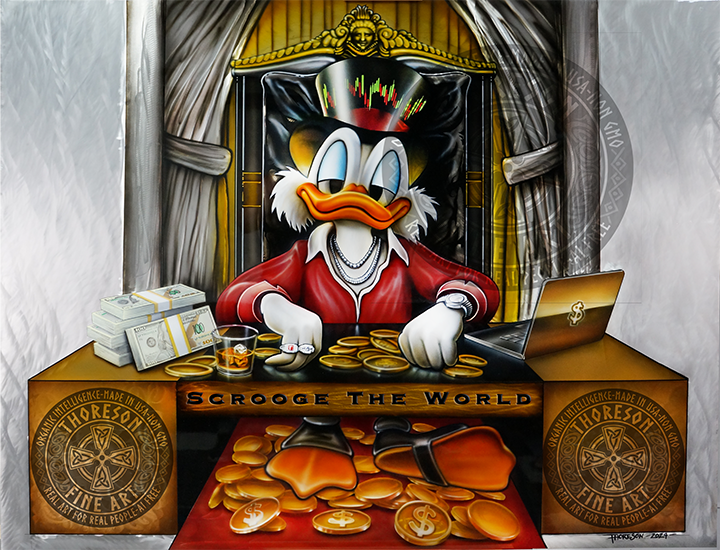 Acrylic on Aluminum 2024 Original. The Merging of Scrooge McDuck with a modern Scarface...